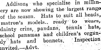 Addisons who specialise in millinery are now showing the largest range of the season. Hats to suit all heads, matron’s models., ready to. wears,, dainty crins, pandans, tennis bats, school panamas and' children’s orgdndy hats and bonnets. Inspection invited.—Advt. , -