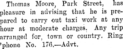 Thomas Moore, Park Street, has pleasure in advising that he is prepared to carry out taxi work at any hour at moderate charges. Any trip arranged for, town or country. Ring ’phone No. 176,—Advt,