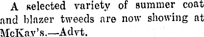 A selected variety of summer coat and blazer tweeds are now showing at McKay’s.—Advt.