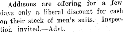 Addisons n.re offering for a .few days only a liberal discount for cash on their stock of men’s suits. Inspection invited.—Advt.