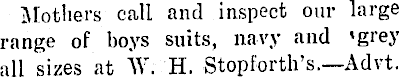 Mothers call and inspect our large range of hoys suits, navy and 'grey all sizes at W. H. Stopforth’s.—Advt.