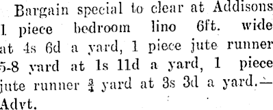 Bargain special to clear at Addisons 1 piece bedroom lino 6ft. wide at 4s 6cl a yard, 1 piece jute runner 5-8 yard at Is lid a yard, 1 piece jute runner 3 yard at 3s 3d a yard. Advt.