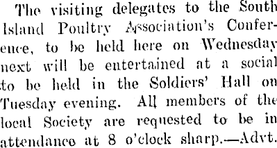 The visiting delegates to the South Island Poultry Association’s Conference, to he held here on Wednesday next will he entertained at a social .to he held in the Soldiers’ Hall on Tuesday evening. All members of the local Society are requested to he in attendance) at 8 o’clock sharp.—Advt.