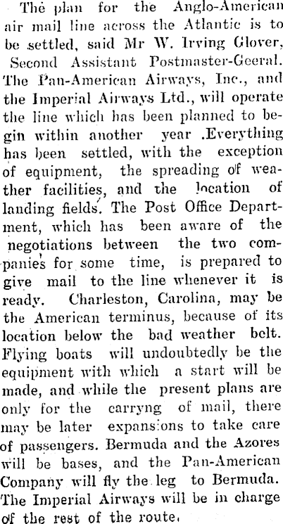 The plan for the Anglo-American air mail line across the Atlantic is to be .settled, said Mr W. Irving Glover, Second Assistant Postmaster-Geeral. The Pan-American Airways, Inc., and the Imperial Airways Ltd., will operate the line which has been planned to begin within another year .Everything has been settled, with the exception of equipment, the spreading of weather facilities, and the location of landing fields. The Post Office Department, which has been aware of the negotiations between the two companies for some time, is prepared to give mail to the line whenever it is ready. Charleston, Carolina, may he the American terminus, because of its location below the had weather belt. Flying boats will undoubtedly he the equipment with which a start will be made, and while the present plans are only for the carryng of mail, there may be later expansions to take care of passengers. Bermuda and the Azores will be bases, and the Pan-American Company will fly the leg to Bermuda. Tlie Imperial Airways will be in charge of the rest of the route,