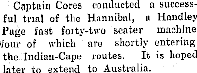 Captain Cores conducted a successful trial of the Hannibal, a Handley Page fast forty-two seater machine four of which are shortly entering the Indian-Cape routes. It is hoped later to extend to Australia.