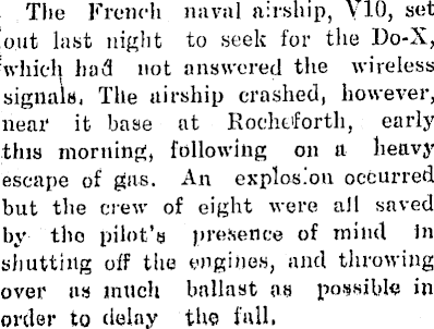 The French naval airship, VlO, set out last night to seek for the Do-X, which had not answered the wireless signals, The airship crashed, however, near it base at Roche'fortli, early this morning, following on a heavy escape of gas. An explos.on occurred but the crew of eight were all saved by the pilot’s presence of milul In shutting off the engines, and throwing over as much ballast as possible in order to delay the full.