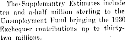 The-Supplemantry Estimates include ten and n-lialf million sterling to tlie Unemployment Fund bringing the 1930 Exchequer contributions up to thirtytwo millions.