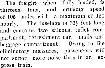 The freight when fully loaded, is thirteen tons, and cruising speed of 105 miles with a maximum of 120 hourly. Tlie fuselage is 76£ feet long and contains two saloons, toilet compartment, refreshment car, mails and baggage compartment. Owing lo the eliminatory measures, passengers will not suffer more noise than in an express train.