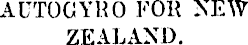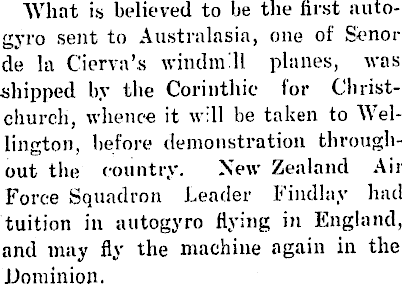 What is believed to be the first autogyro sent to Australasia, one of Senor de la Cierva’s windmill planes, was shipped by the Corinthie for Christchurch, whence it will he taken to Wellington, before demonstration throughout the country. New Zealand Air Force Squadron Leader Findlay had tuition in autogyro flying in England, and may fly the machine again in the Dominion.