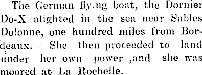 The German fly.ng boat, the Dornier Do-X alighted in the sea near Sables Dolonne, one hundred miles from Bordeaux. She then proceeded to land under her own power ,and she was moored at La Rochelle.