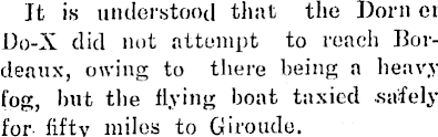 It is understood that the Dorn or Do-X did not attempt to reach Bordeaux, owing to there being a heavyfog, hut the flying boat taxied safely for fifty miles to Gironde.