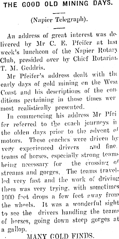 THE GOOD OLD MINING DAYS. (Napier Telegraph). An address of great interest was delivered by Air C. E. Pfeifer at last week’s luncheon of the Napier Rotary Club, presided over by Chief Rotariai, T. M. Geddris. Mr Pfeifer’s address dealt with tin early days of gold mining on the A\ est Coast and his descriptions of the conditions pertaining in those times wer most realistically presented. In commencing his address Mr Piei for referred to the coach journeys ii the olden days prior to the advent o< motors. These coaches were -driven by very experienced drivers r.nd fine teams of horses, especially strong teams being necessary for the crossing o 1 streams and gorges. The teams travelled very last and the work o, driving them was very trying, with sometimes 1099 feet drops a few feet away from the wlmels. It was a wonderful sight to see the drivers handling the teams oF horses, going down steep gorges at a gallop. MANY GOLD FINDS.