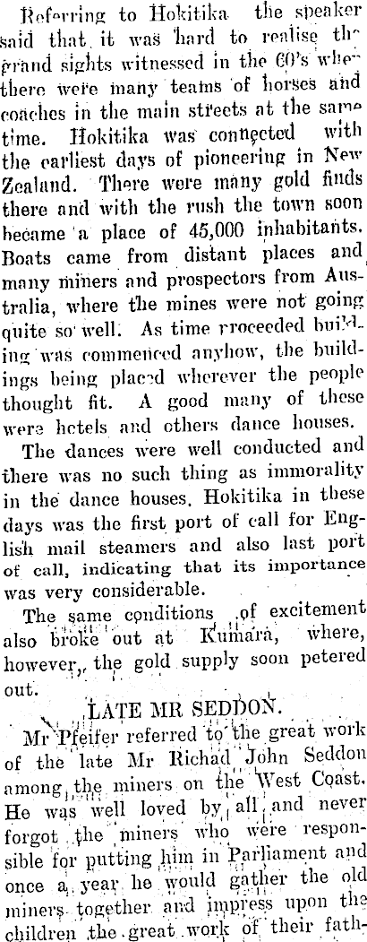 Referring to Hokitika the speaker said that it was hard to realise th" grand sights witnessed in the 69’s wbe there were many teatas of horses and coaches in the main streets at the sam® time. Hokitika was connected with the earliest days of pioneering in New Zealand. There were many gold finds there and with the rush the town soon became a place of 45,000 inhabitants. Boats came from distant places and many miners and prospectors from Australia, where the mines were not goingquite so well. As time proceeded bui.-L ing was commenced anyhow, the buildings being placed wherever the people thought fit. A good many of these were betels and others dance houses. The -dances were well conducted and there was no such thing as immorality in the dance houses. Hokitika in these days was the first port of call for English mail steamers and also last port of call, indicating that its importance was very considerable. The same cpnditions .pf excitement also broke ; out at Kmmara, where, however,, the gold supply soon petered out. , , LATE MR SEDDON. Mr Phifer referred to'the great work of the late Mr Richad ’John Seddon among, the miners on the AVest Coast. He was well loved bye ( all,,and never forgot (he miners who were responsible for putting him in Parliament and once a. year, he would gather the old miner?- together and impres.s upon the children ’ .the ■ great.work of ‘ their fath-