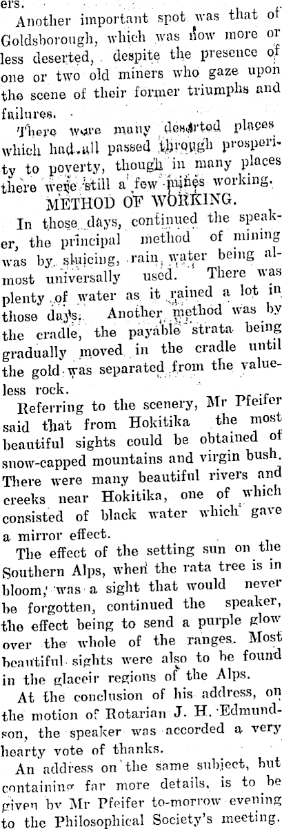 ers. Another important spot was that of Goldsborough, which was iSow more or less deserted, despite the presence of one or two old miners who gaze upon tiro scene of their former triumphs and failures. • There were many desArtoa places which had*all passed tjpm'gh prosperity to poverty, though m many places there weije ’still a few working. METHOD OF WORKING. In those, days, continued the speaker, the principal method of mining was by. sluicing, rain, water being almost universally used. There was plenty of water as it rained a lot m those day's. Another method was by the cradle, the payable strata being gradually moved in the cradle unti the gold-was separated from the valueless rock. . Referring to the scenery, Mr Pfeirer said that from Hokitika the most beautiful sights could be obtained oi snow-capped mountains and virgin bush There were many beautiful rivers anc creeks near Hokitika, one of which consisted of black water which ga\ e a mirror effect. The effect of the setting sun on the Southern Alps, wheii the rata tree is in bloom,’ was a sight that would nevei be forgotten, continued the speakei, the effect being to send a purple glow over the whole of the ranges. Most beautiful sights were also to be found in the glaceir regions of the Alps. At the conclusion of his address, on the motion of Rotarian J. H. -Edmondson, the speaker was accorded a very hearty vote of thanks. An address on tlie same subject, but containing far more details, is to be given bv Mr Pfeifer to-morrow evening to the Philosophical Society’s meeting.