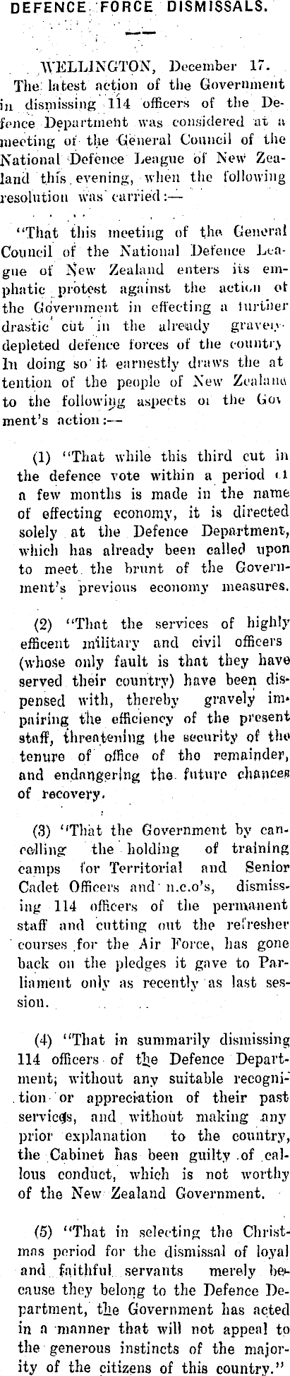 defence force dismissals. WELLINGTON, December 17. The latest action of the Government in dismissing 114 officers of the Defence Department was considered at a meeting of the General Council of the National Defence League of New Zealand this. evening, when the following resolution was carried : “That this meeting of the General Council of the National Defence League of New Zealand enters its emphatic protest against the action ot the Government in effecting a lnrther drastic cut in the already graven depleted defence forces of the country In doing so it earnestly draws the at tention of the people of New Zealand to the following aspects oi the Gov ment’s action: — (1) “That while this third cut in the defence vote within a period <1 a few months is made in the name of effecting economy, it is directed solely at the Defence Department, which has already been called upon to meet the brunt of the Government’s previous economy measures, (2) “Thnt the services of highly efficent military and civil officers (whose only fault is thnt they have served their country) have been dispensed with, thereby gravely im* pairing the efficiency of the present stnff, threatening the security of the tenure of office of tho remainder, and endangering the future chances of recovery. (3) “That the Government by cancelling the holding of training camps for Territorial and Senior Cadet Officers and n.c.o’s, dismissing 114 officers of the permanent staff and cutting out the refresher courses for the Air Force, has gone back on the pledges it gave to Parliament only as recently as last session. (4) “That in summarily dismissing 114 officers of t]ie Defence Department; without any suitable recognition or appreciation of their past sendees, and without making any prior explanation to the country, the Cabinet has been guilty .of callous conduct, which is not worthy of the New Zealand Government. (5) “That in selecting the Christmas period for the dismissal of loyal and faithful servants merely be>cause they belong to the Defence Department, the Government has acted in a manner that will not appeal to the generous instincts of the majority of the citizens of this country.”
