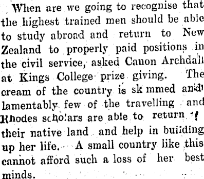 When are we going to recognise that the highest trained men should he able to study abroad and return to New Zealand to properly paid positions in the civil service, asked Canon Archdall at Kings College prize giving. The cream of the country is sit mmed and! lamentably few of the travelling and Rhodes scholars are able to return -f their native land and help in building up her life. A small country like this cannot afford such a loss of her best minds.