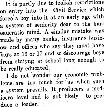 It is partly due to foolish restrictions on entry into the Civil Service which force a boy into it at an early age with a system of seniority dear to the bureaucratic mind. A similar mistake was made by many banks, insurance business and offices who say they must have boys at 16 or 17 and so discourage boys from staiyng at school long enough to be really educated. I do not wonder our economic problems are too much for us when .such a system prevails. It producers a mediocre level and is not likely to produce a leader.