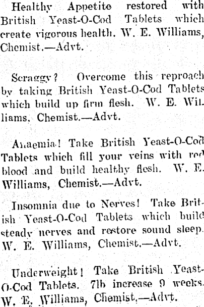 Healthy Appetite restored with British Yeast-O-Cod Tablets which create vigorous health. W. E. Williams, Chemist. —Advt. Seracrcty ? Overcome this reproach by taking British Yeast-O-Cod Tablets which build up linn flesh. W. E. Williams. Chemist. —Advt. Anaemia! Take British ea-st-O-Cocl Tablets which fill your veins with red blood and build healthy flesh. W. E. Williams, Chemist. —Advt. Insomnia due to Nerves! 'lake British Yeast-O-Cod Tablets which build steady nerves and restore sound sleep. W. E. Williams, Chemist—Advt. Underweight [ Take British Yeast-O-Cod Tablets. 71b increase 9 weeks. W. E. Williams, Chemist, —Advt.