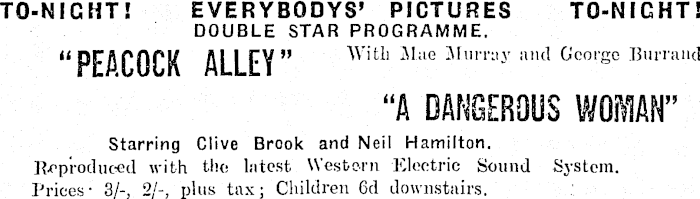 TO-NIGHT! EVERYBODYS’ PICTURES TO-NIGHT! DOUBLE STAR PROGRAMME. “PEACOCK “A DANGEROUS WOMAN” Starring Clive Brook and Neil Hamilton. Reproduced with the latest Western Electric Sound System. Prices- 3/-, 2/-, plus tax; Children Gd downstairs. ALLEY With Mae Murray and ocorce Jim-rand