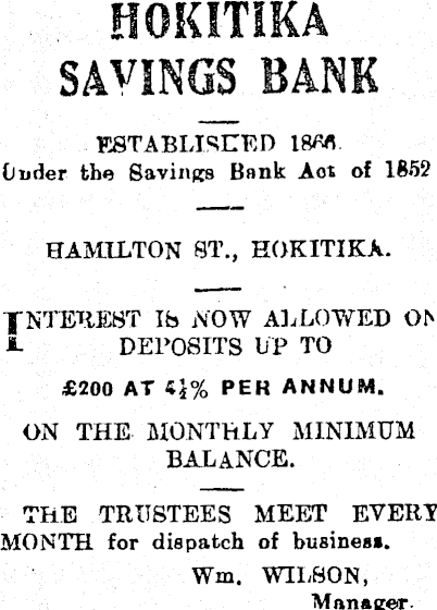 HOKITIKA SAVINGS BANK ESTABLISHED IRAK t/Tider the Savings Bank Aot of 1852 HAMILTON ST., HOKITIKA. I NTEREST lb NOW ALLOWED ON A DEPOSITS UP TO £2OO AT *J% PER ANNUM. ON THE MONTHLY MINIMUM BALANCE. THE TRUSTEES MEET EVERY MONTH for dispatch of business. Wm. WILSON, Manager