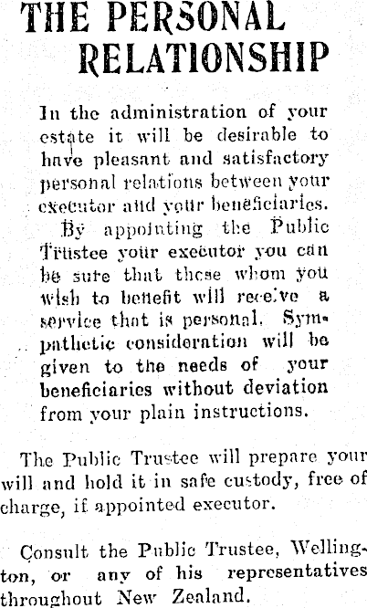 THE PERSONAL RELATIONSHIP In the administration of your estate it will be desirable to have pleasant and satisfactory personal relations between your executor aiid yotir beneficiaries. By appointing the Public TiHistee yotir executor you ctin be sute that these whom you wish to benefit will receive a service that is personal, Sympathetic consideration will ha given to the needs of your beneficiaries without deviation from your plain instructions. The Public Trustee will prepare your will and hold it in safe custody, free of charge, if appointed executor. Consult the Public Trustee, Wellington, or any of his representatives throughout New Zealand.