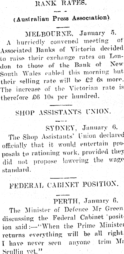 RANK RATES. (Australian Press Association) MELBOURNE, January 5. A hurriedly convened meeting of Associated Banks of Victoria decided to raise their exchange rates on London to those of the Bank of New South Wales cabled this morning hut their celling rate will be £2 6s more. 'Hie increase of the Victorian rate is therefore £6 10s per hundred. SHOP ASSISTANTS UNION. SYDNEY, January 6. The Shop Assistants’ Union declared officially that it would entertain proposals to rationing work, provided they did not propose lowering the wage standard. FEDERAL CABINET POSITION. PERTH, January 6. The Minister of Defence Air Green, discussing the Federal Cabinet position said: —“When the Prime Minister returns everything will be all right. I have never seen anyone trim Mr Scull in vet. ”
