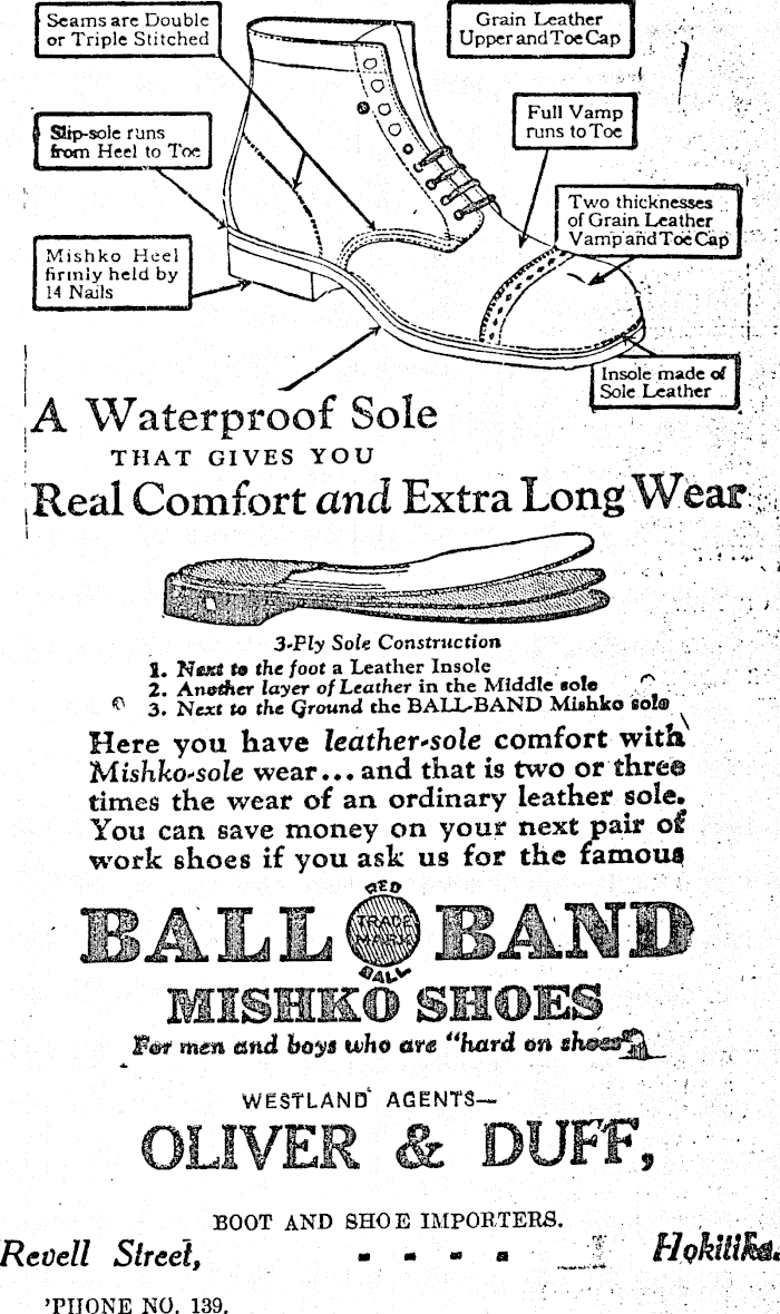 Grain Leather Upper and Toe Cap Scams are Double or Triple Stitched Full Vamp runs to Toe Slip-sole runs from Heel to Toe Mishko Heel firmly held by 14 Nails A Waterproof Sole THAT GIVES YOU Real Comfort and Extra Long Wear 3-Ply Sole Construction 1. Next to the foot a Leather Insole 2. Another layer of Leather in the Middle sole 3» N ext to the Qround the BAUL-BAND Mishko ®o!® Here you Have leather-sole comfort with M ishko-sole wear... and that is two or three times the wear of an ordinary leather sole* You can save money on your next pair of work shoes if you ask us for the famous IB AIL 3L #l® AMD MISHKO SHOES Wm men and boys who arts “hard on th* WESTLAND' AGENTS—OLIVER & DUFF, ReCell Street , BOOT AND SHOE IMPORTERS. HoMHMz PHONE NO. 139.