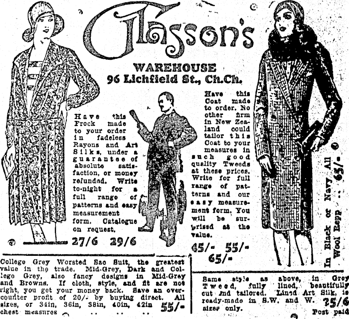 0 / sons WAREHOUSE n Lichfield BL, Ch. Ch. Have this Frock made to your order 1 n fadeless Rayons and Art Silks, under a guarantee of absolute satisfaction, or money refunded, Write to-night for a full range of patterns and easy measurement form, Catalogue on request, 27/6 29/6 College Grey Worsted Sao Suit, the greatest value in the trade. Mid-Grey, Dark and Collego Grey, also fancy designs In Mid-Grey and Browns. If doth, style, and lit are not light, you get your money back. Save an ov«rcourtter profit of 20/- by buying direct. All sires, or 311 n, S6ln, SBin, 40in, 421 n sa/Have this Coat made to order, ft o other Ann In New Zealand could tailor this Coat to your measures In such good quality Tweeds at these prices. Write for full range of patterns and our easy measurement form. You Will be surprised at the value. 45/* 55/- ' 65/chest measures * Same style as above, in Orey Tweed, fully lined, beautifully cut md tailored. Xlned Art. Silk, le ready-made In S.W. and W. 75/6 A Post paid Bizet only.
