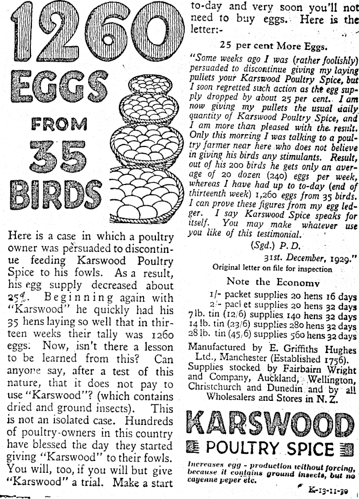 260 MSS FROM 55 BIRDS Here is a case in which a poultry owner was persuaded to discontinue feeding Karswood Poultry Spice to his fowls. As a result, his egg supply decreased about 35 i. Beginning again with ''Karswood” he quickly had his 35 hens laying so well that in thirteen weeks their tally was 1260 eggs. Now, isn’t there a lesson to be learned from this? Can anyone say, after a test of this nature, that it does not pay to use "Karswood”? (which contains dried and ground insects). This is not an isolated case. Hundreds of poultry-owners in this country have blessed the day they started giving "Karswood” to their fowls. You will, too, if you will but give "Karswood” a trial. Make a start to-day and very soon you’ll not need to buy eggs. Here is the letter:- „ 25 per cent More Eggs. “Some weeks ago I was (rather foolishly) persuaded to discontinue giving my laying pullets your Karswood Poultry Spice, but I soon regretted such action as the egg supply dropped by about 25 per cent . lam now giving my pullets the usual daily quantity of Karswood Poultry Spice, and I am more than pleased with the. result. Only this morning I u>as talking to a poultry farmer near here who does not believe in giving his birds any stimulants. Result, out of his 200 birds he gets only an average of 20 dozen (240) eggs per week, whereas I have had up to to-day (end of thirteenth week) 1,260 eggs from 35 birds. I can prove these figures from my egg ledger. I say Karswood Spice speaks for itself. You may make whatever use you like of this testimonial. (Sgd.) P. D. 31st. December, 1929.” Original letter on file for inspection Note the Economy 11- packet supplies 20 hens 16 days 2- pad et supplies 20 hens 32 days 7lb. tin (i2;6) supplies 140 hens 32 days 14 lb. tin (23/6) supplies 280 hens 32 days 28 lb. tin (45;b) supplies 560 hens 32 days Manufactured by E. Griffiths Hughes Ltd., Manchester (Established 1756). Supplies stocked by Fairbairn Wright and Company, Auckland, Wellington, Chris tchurch and Dunedin and by all Wholesalers and Stores in N. Z. KARSWOOD m POULTRY SPICE W Increases egy - production icithout forcing because it contains ground insects, but no cayenne peper eic. " K-13-H-J8 ,