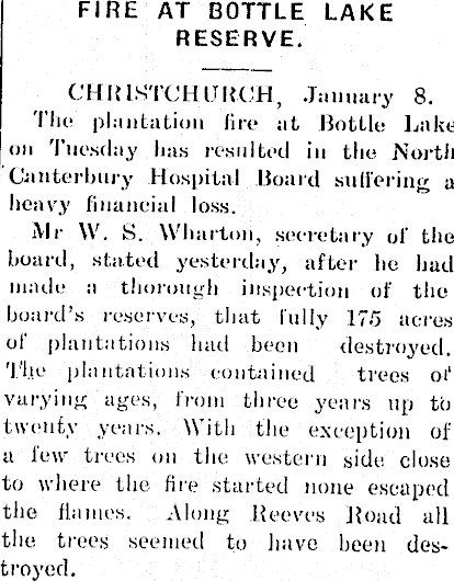 FIRE AT BOTTLE LAKE RESERVE. CHRISTCHURCH, January 8. The plantation lire at Bottle Lake on Tuesday has resulted in the North Canterbury Hospital Board suffering a heavy financial loss. All- W. S. Wharton, secretary of the board, stated yesterday, after be had made a thorough inspection of the hoard’s reserves, that fully 175 acres of plantations had been destroyed. Tlie plantations contained trees oi‘ varying ages, from three years up to twenty years. With the exception of a few trees on the western side close to where the fire started none escaped the flames. Along Reeves Road all the trees seemed to have been destroyed.