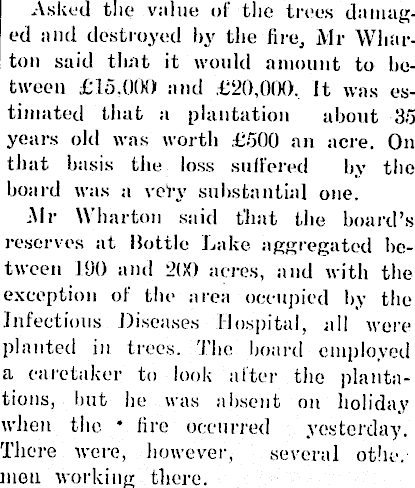 Asked the value ol the trees damaged and destroyed hy the fire, Mr Wharton said that it would amount to between £15.000 and £20,000, It was estimated that a plantation about 35 years old was worth £SOO an acre. On that basis the loss suffered hv the hoard was a very substantial one. Air Wharton said that the hoard’s reserves at Bottle Lake aggregated between 190 and 200 acres, and with the exception of the area occupied hy the Infectious Diseases Hospital, all were planted in trees. The hoard employed a caretaker to look after the plantations, hut he was absent on holiday when the * fire occurred yesterday. There were, however, several othc. men working there.