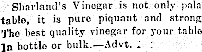Sharlnnd’s Vinegar is not only palatable, it is pure piquant and strong, The best quality vinegar for your tablo, Jn bottle or bulk.—Advt. *