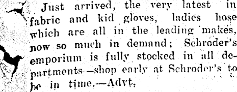 Just arrived, the very latest in fabric and hid gloves, ladies hose ■ndiich are all in the leading makes, so much in demand; Schroder’s emporium is fully stocked in all departments -shop early at Schroder’s t ; o in time. —Advt,