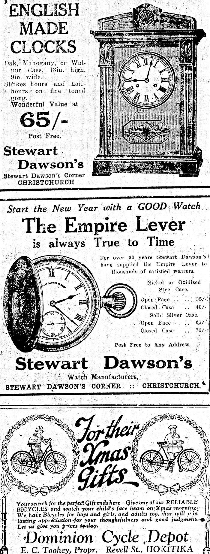 Oak,' Mahogany, or Wal--7i ut Case, loin, high, yin. wide. Strikes hours and tiailhours on fine toned £ong. Wonderful Value at /■ Post Free. Stewart Dawson’s Stewart Dawson’s Corner CHRISTCHURCH / % V. Ik m hi sail HI IllsM Start the New Year with a GOOD Watch The Empire Leyer is always True to Time For over 30 years Stewart Dawson’s ■ liave supplied tin 'Empire Lever to thousands of satisfied wearers. Nickel or Oxidised Steel Case. Open Face .. .. 35/-'. Closed Case .. 40/Solid Silver Case. Open Face .. 65/Closed Case .. 70/Post Free to Any Address. Stewart Dawson’s ' Watch Manufacturers, STEWART DAWSON’S CORNER :: CHRISTCHURCH. 4 I V. VJt Your search for the perfect Qift ends here—Qive on? of our RELIABLE BICYCLES and watch your child’s face beam on Xmas morning; We have Bicycles for boys and girls, and adults top, that will yin lasting appreciation for your thoughtfulness and good judgment-. - Let us give you prices Unlay. 'Dominion Cycle Depot E. C. Toohey, Propr. Revell St., HO &ITIKA