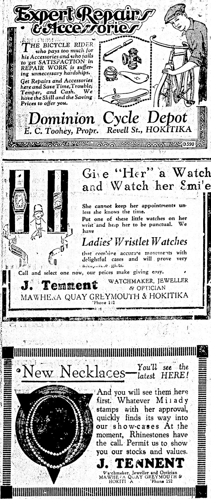 Y\&Tr V The bicycle rider who pays too muck for his Accessories and who fails to get SATISFACTION in REPAIR WORK is suffering unnecessary hardships. . Qet Repairs and Accessories i here and Save Time,Trouble, ! Temper, and Cash. We j have the Skill and the Saving !■ Prices to offer you. -CDominion Cycle Depot Is. C. Toohey, Pvopr, Revell St., HOKITIKA SZJBZ fli/vWsv'itev 0590 Eli ✓ i.v'.w £ r p elect c J. Tesesienf GLe “Her” a Watch and Watch her Smi’e She cannot keep her appointment* unless she knows the time. Put one of these little watches on her wrist and heip her to be punctual. We have Ladies ? Wristlet Watches that combine accurate movements with delightful cases and will prove very gilts. Call and select one now, our prices make giving easy. • WATCHMAKER, JEWELLER & OPTICIAN MAWHEaA QUAY GRtYMOUTH & HOKITIKA 'Phone 132 St* Neckla You’ll see the ‘latest HERE! And you will see them here 55 ftrst. Whatever Milady Ejj stamps ivith her approval, 55 quickly finds its way into EE our show-cases At the S moment, Rhinestones have 55 the call. Permit us to show Sr you our stocks and values. EE J. TEtfNENT g Wchmaker, Jeweller and Oprician MAWHE<A QuAY GREYMOUIH & =E HOKITI A 'Phon* 152 ~
