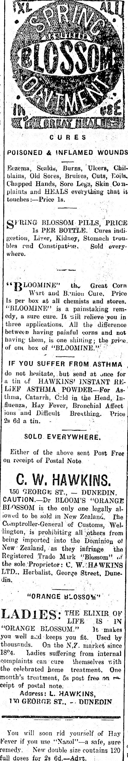 ae m v i CURES POISONED & INFLAMED WOUNDS > Eczema, Scaled, Burns, Ulcers, Chilv blains, Old Sores, Bruises, Guts, Boils, ) Chapped Hands, Sore Legs, Skin Co n- . plaints and HEALS everything that it , touches :—Price Is. QLRING BLOSSOM PILLS, PRICE gestion, Liver, Kidney, Stomach troubles ond Constipation, Sold everywhere. thv Great Corn Wart and B.uiion Cure. Price Is per box at all chemists and stores. “BLOOMJNE” is a painstaking remedy, a sure cure. It will relieve you in three applications. All the difference between having painful corns and not having them, is one shining; the price, of om box of “BLOOMINE.” IF YOU SUFFER FROM ASTHMA , do not hesitate, but send at once for a tin of HAWKINS’ INSTANT RELIEF ASTHMA POWDER—For Asthma, Catarrh, Odd in the Head, Influenza, Hay Fever, Bronchial Affect .ions and Difficult Breathing. Price 2s 6d a tin. SOLD EVERYWHERE. Either of the above sent Post Free on receipt of Postal Note C. W. HAWKINS. 150 GEORGE ST., DUNEDIN. CAUTION.— Dr BLOOM’S “ORANGE BLOSSOM is the only one legally allowed to be sold in New Zealand. The Comptroller-General of Customs, Weiiington, is prohibiting all .others from being imported into the Dominion of New Zealand, as they infringe the Registered Trade Mrrk “Blossom” ,-.f the sole Proprietor: C. W.HAWKINS LTD.. Herbalist, George Street. Dunedin. “ORANGE BLOSSOM” L 4 IQ ITRm * the elixir of life is in “ORANGE BLOSSOM.” It makes you well a»:d keeps you fit. Used by thousands. On the N,7. market since 18°4. Ladies suffering from internal complaints can cure themselves with the celebrated home treatment. One month’s treatment, 5s post free on receipt of postal note. Address: L. HAWKINS, IVI GEORGE ST., -• DUNEDIN You will soon rid yourself of Hay Fever if vou use “Na.zol”—a safe, sure * ' c remedy. New double size contains 120 fuli doses for 2s 6d.—Adrt. j