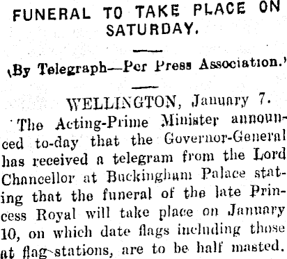 FUNERAL TO TAKE PLACE ON SATURDAY. \By Telegraph—Per Press Association.* WELLINGTON, January 7. ' The Acting-Prime Minister announced to-day that the Governor-General has received a telegram from the Lord Chancellor at Buckingham Palace stating that the funeral of the late Princess Royal will take place on January 10, on which date flags including those at flag stations, are to be half masted.