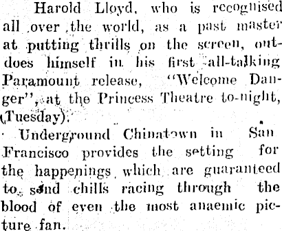 Harold Lloyd, who is recognised all .over .the world, as a past master at putting thrills on the semen, outdoes himself in. his first all-talking Paramount release, “Welcome Danger”, at the Princess Theatre to-night, t,Tuesday). Underground Chinatown in San Francisco provides the setting for the happenings, which are guaranteed t 0... chills racing through the blood of even the most anaemic picture, fan.