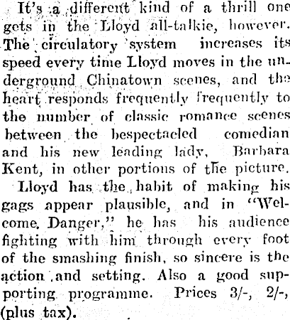 It’s .a (different kind of a thrill one gets in the Lloyd all-talkie, however. The circulatory system increases its speed every time Lloyd moves in the underground Chinatown scenes, arid the heart responds frequently frequently' to the number of classic romance scenes between the bespectacled comedian and his new leading lady’, Barbara Kent, in other portions of the picture. Lloyd has the habit of making his gags appear plausible, and in “Welcome. Danger,” lie lias his audience fighting with him through every foot of the smashing finish, so sincere is the action .and setting. Also a good supporting programme. Prices 3/-, 2/-, (plus tax).