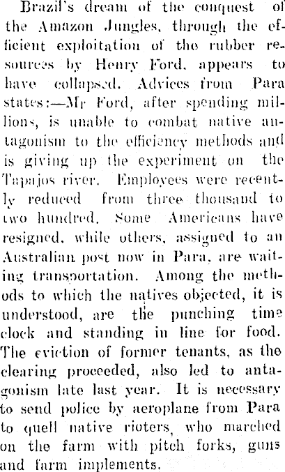 Brazil's dream of the conquest of the Amazon Jungles, through the efficient exploitation of the rubber resources by Henry Ford, appears to have eollap.srd. Advices from Para statesMr Ford, after spending millions, is unable to combat native antagonism to the efficiency methods and is giving up the experiment on the Tapajos river. Employees were recently reduced from three thousand to lwo hundred. Some Americans have resigned, while others, assigned to an Australian piut now in Para, are waiting transportation. Among the methods to which the natives objected, it is understood, are tlie punching time clock and standing in line for food. The eviction of former tenants, as the clearing proceeded, also led to antagonism late last year. It is necessary to send police by aeroplane from Para to quell native rioters, who marched on the farm with pitch forks, guns and farm implements.