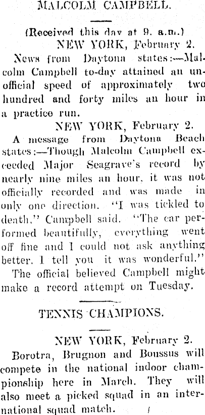 Malcolm Campbell. (Received this dnv at 9. a.m.) NEW YORK, February 2. News from Daytona states:—Malcolm Campbell to-day attained an unofficial speed of approximately two hundred and forty miles an hour in a practice run. NEW YORK, February 2. A message from Daytona Beach states: —-Though Malcolm Campbell exceeded Major Seagravc's record by nearly nine miles an hour, it was not officially recorded and was made in only one direction. ‘‘l was tickled to dentil,” Campbell said. “The car performed beautifully, everything went off hue and 1 could not ask anything better. I tell you it was wonderful.” The official believed Campbell might make a record attempt on Tuesday. TENNIS CHAMPIONS. NEW YORK, February 2. Borotra, Brugnon and Boussus will compete in the national indoor championship here in March. They will also meet a picked squad in an international squad match. /