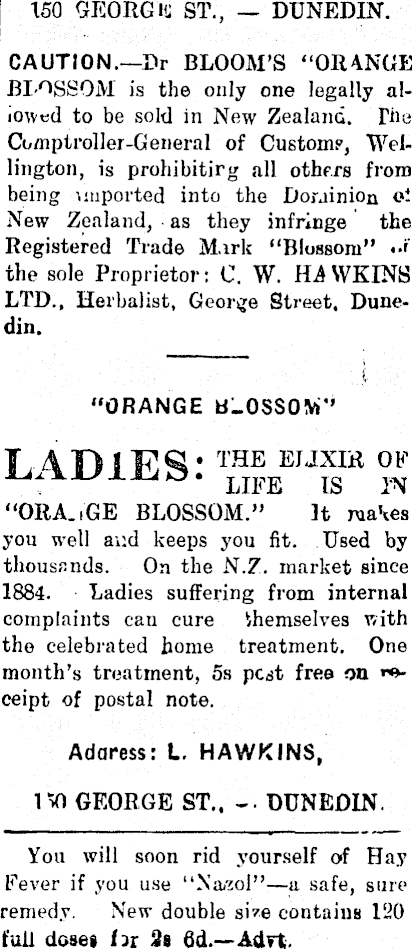 150 GEORGE ST., DUNEDIN. CAUTION.— Dr BLOOM’S “ORANGE BLOSSOM is the only one legally allowed to be sold in New Zealand. The Comptroller-General of Custom?, Wellington, is prohibitirg all others from being unported into the Dominion oi New Zealand, as they infringe the Registered Trade Mark “Blossom” «•' the sole Proprietor: C. W. HAWKINS LTD., Herbalist, George Street. Dunedin. “ORANGE d-OSSOVi” T ArUDe* THE EJJXIR OF IjAiillljS. LJFE Tg rN “ORA.iGE BLOSSOM.” It makes you well and keeps you fit. Used by thousands. On the N.Z. market since 1884. Ladies suffering from internal complaints can cure themselves with the celebrated home treatment. One month’s treatment, 5s pest free on receipt of postal note. Adaress: L. HAWKINS, 150 GEORGE ST..-• DUNEDIN. You will soon rid yourself of Hay Fever if you use “Na/ral”—a safe, suit 1 remedy. New double si?e contains 120 full doses far 2s 6d.—Ad?t.