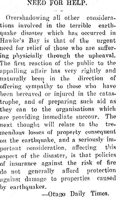 NEED FOR HELP, Overshadowing all other considerations involved in the terrible earthquake disaster which has occurred in Hawke's Bay is that of the urgent need for relief of those who are suffering physieinlly through the upheaval. The first reaction of the public to the appalling affair has very rightly and naturally been in the direction of offering sympathy to those who have been bereaved or injured in the catastrophe, and of preparing such aid ns they can to the organisations which are providing immediate succour. The next thought will relate to the tremendous losses of property consequent on the earthquake, and a seriously important consideration, affecting this aspect of the disaster, is that policies of insurance against the risk of fire do not generally afford protection against damage to properties caused by earthquakes. —Otago Daily Times.