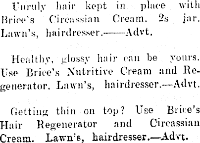 Unruly hair kept in place with Brice's Circassian Cream. 2s jar. Lawn’s, hairdresser. Aclvt. Healthy, glossy hair can be voars. Use Brice’s Nutritive Cream and Regenerator. Lawn’s, hairdresser.—Aclvt. Getting thin on top? Use Brice’s Hair Regenerator and Circassian Cream. Lawn’s, hairdresser.—Advt.