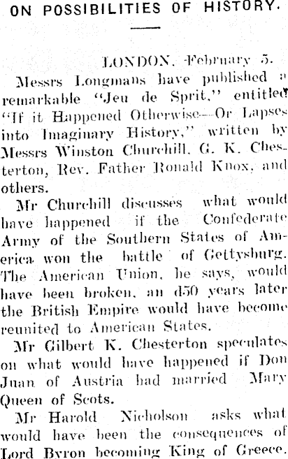 ON POSSIBILITIES OF HISTORY. LONDON. -February 5. Messrs Longmans have published a remarkable “Jen tie Sprit.” entitled“ff jt Happened Otherwise Or Lapses into Imaginary History,” written by Messrs Winston Churchill. 0. K. Chesterton, Rev. Father Ronald Knox, and others. Air Churchill dismisses what would have happened if the Confederate Army of the Southern States ol America. won the battle of Gettysburg. 'The American Union, lie says, would have been broken, an dSO years later the British Empire would have become reunited to American Slates. Air Gilbert K. Chesterton speculates on what would have happened if Don Juan of Austria had married Alary Queen of Scots. Air Harold Nicholson asks what would have been the consequences of Lord Byron becoming King of Greece.