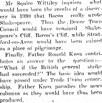 AIT Squire AVittilev inquires what would have been the results of a discovery in 1930 that Bacon really wrote Shakespeare. Thus the , Dover Town Council would have renamed Shakepcare’s Cliff. Bacon’s Cliff, while Strat-ford-on-Avon would have been ruined as a place of pilgrimage. Finally. Father Ronald Knox contributes an answer to the question : “What if the British general strike had succeeded ?’’ The basic idea would have passed under Trade Union censorship. Father Knox parodies the news columns as they would have thus been produced.