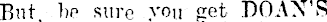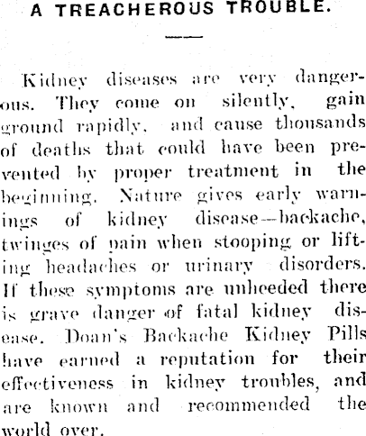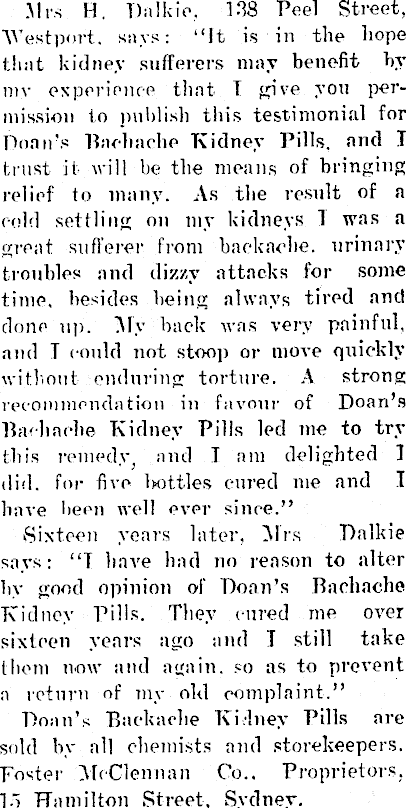 Mrs H. Dalkie. 138 Peel Street, AVestport, says: “It is in the hope that kidney sufferers may benefit by my experience that 1 give you permission to publish this testimonial for Doan’s Bachache Kidney Pills, and T trust it will be the means of bringing relief to many. As the result of a cold settling on my kidneys 1 was a great sufferer from backache, urinary troubles and dizzy attacks for some time, besides being always tired and done ii)). Afy back was very painful, and l could not stoop or move quickly without, enduring torture. A strong recommendation in favour of Doan’s Bachache Kidney Pills led me to try this remedy, and T am delighted I did. for five Kittles cured me and I have been well ever since.” (Sixteen years later. Airs Dalkie says : “T have bad no reason to alter by good opinion of Doan’s Bachache Kidney Pills. They cured me over sixteen years ago and T still take them now and again, so as to prevent a return of my old complaint.” Doan’s Backache Kidney Pills are sold by all chemists and storekeepers. Foster AlcClennan Co., Proprietors, 15 Hamilton Street, Sydney.