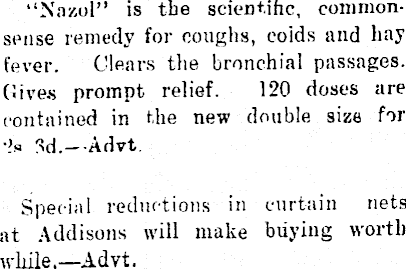 “N'azol” is the scientific, commonsense remedy for coughs, coids and hay fever. Clears the bronchial passages. Gives prompt relief. 120 doses are contained in the new double size for •Is !>d.—-Advt Special reductions in curtain nets at Addisons will make buying worth while.—Advt.