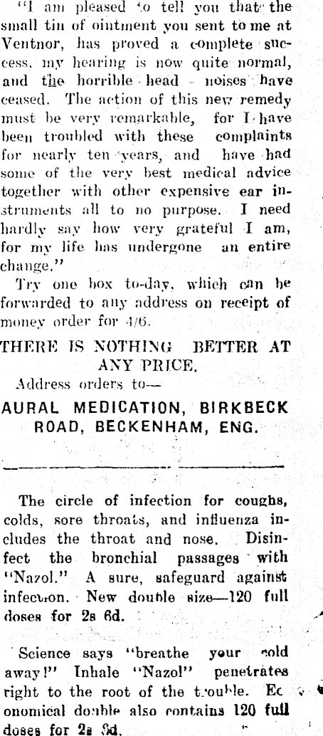“ I am pleased to tel! you that" the small tin of ointment you sent tome at Ventnor, lias proved a. complete success, my hearing is now quite normal, and the horrible head noises have ceased. The action of this new remedy must be very remarkable, for I - have been troubled with these complaints for nearly ten years, and have had some of the very best medical advice together with other expensive ear instruments all to no purpose. I need hardly say how very grateful I am, for my life has undergone an entire change.” Try one box to-day. which can he forwarded to any address on receipt of money order for I/t 5. THERE IS NOTHING BETTER AT ANY PRICE. Address orders to— AURAL MEDICATION, BIRKBECK ROAD, BECKENHAM, ENG. The circle of infection for coughs, colds, sore throats, and influenza includes the throat and nose. Disinfect the bronchial passages with “Nazol.” A sure, safeguard against infecuon. New double size—l2o full doses for 2s fid. Science says “breathe your cold away!” Inhale “Nazol” penetrates right to the root of the t:*ouHe. Ec onomical double also contains 120 full doses for 2e fid.