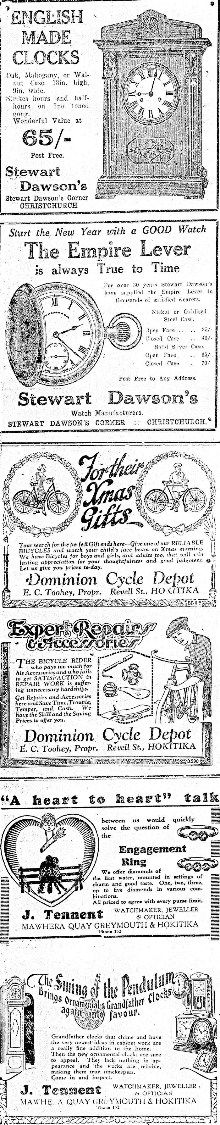 imßigMHgiramraprampmPHg CLOCKS Oak, Mahogany, or Walmn Case. inin. high, 9in. wide. Strikes hours arid halfhours on fine toned non p'. Wonderful Value at 65/Post Free. Stewart Dawson’s Stewart Dawson’s Corner CHRISTCHURCH api'BflwiaßiiiL uijaxwastc?mai^gTgxnOTSg gagggSlSlgi netamumsamn 1 T* %* FI V V. ??s»aiiiiw liMfiSl fj 3V~/ - 1 - 1 wKESST Start the New Year with a GOOD Watch The Empire Lever is always True to Time I * ~3 m m v or over 30 years fcitcwart Dawson’s i:ive supplied tin: Empire Lever to thousands of satisfied wearers. Nickel or Oxidised Steel Case. Open Face .. .. 35/Closed Case .. 40/Solid Silver Case. Open Face .. 05/ Closed Case . 70' Post Free to Any Address. Stewart Dawson 5 s Watch Manufacturers.. STEWART DAWSON’S CORNER :: CHRISTCHURCH.^ MiUS I m gm Tour search for the pet fedt Qift ends here—Qive one of our R ELI A BLE | BICYCLES and watch your child’s face beam on Xmas morning, j We have Bicycles for boys and girls, and adults too, that will fin lasting appreciation for your thoughtfulness and good judgment. <$ Let us give you prices to-day. Dominion Cycle Depot E. C. Toohey, Propr. Revell St., HO CIT/KA The bicycle rider who pays too much for his Accessories and who fails to get SATISFACTION in REPAIR WORK is suffering unnecessary hardships. Qet Repairs and Accessories here and Save Time,Trouble, Temper, and Cash. We have the Skill and the Saving Prices to offer you. Yc& < !^>i Dominion Cycle Depot ii. C. Toohey, Propr, Revell St., HOKITIKA heart to heart” talk between us would quickly == solve the question of the Engagement Ring We offer diamonds of the first water, mounted in settings of charm and good taste. One, two, three, up to five diamonds in various combinations. All priced to agree with every purse limit. WATCHMAKER, JEWELLER & OPTICIAN MAWHERA QUAY GREYMOUTH & HOKITIKA ‘Phone 152 J. Tennent t M« Grandfather clocks that chime and have the very newest ideas in cabinet work are a really fine addition to the home. Then the new ornamental cL.cks are sure to appeal. They lack nothing in appearance and the works are reliable, making them true timekeepers. Come in and inspect. WATCHMAKER. JEWELLER • J. iv OPTICIAN MAW HE A QUAY GRi: YMOUTH & HOKITIKA A Phone m rc\ m /T\ \~s. v. "Mij Vf: H A